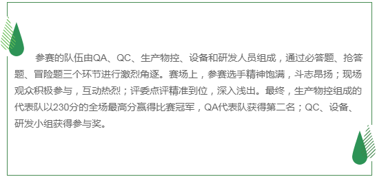 登场比赛充分展示了金美济员工GMP知识水平和朝气茎勃,积极向上的进取精神。鑫后,李海关总对本次比套作总结,他说道:“公司的可持续发展最终依掌的是质量管理团队提供的质呈保障,知识免我有利于员工学习交流和口氏提升,是提高田队凝聚力的有效途径。希望此关活动持填开展下去,并将其常态化,为进一步理解和海立GMP管理、稳主并逐步将开公司产品质量,打造金辨品属名实基础。”知识竟赛展风采 ,创新岁戏新起航。让我们以此次GMP知识竟赛为契机,立足本把忍向,影地古记,汽武西,罪仲都色,四他,也-西的标杆企业的运路上!